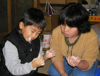 自分で丸めた餅を頬張る諒。右は面倒見の良い川浪さんち長女 ![]() |