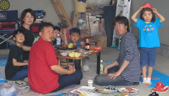 | 6月15日 予報では曇り後雨だったが、夕方に掛けて青空も覗く良い天気となった。 ガラクタだらけの車庫に集った同級生の面々。 この後仙岩への竹の子取りから帰った森家族とまゆが加わり、大いに盛上がった。 |