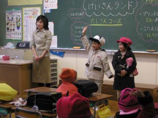 | 今回の授業参観は、繰上り繰下りの足し算引き算を各教室となかよしホールを使い、ゲーム感覚で解いて歩く企画でした。子供達は限られた時間の中、我先に問題のプリントを解き、球入れゲームやスゴロクゲームが待つなかよしホールを目指すのでした。遊び感覚で数字に触れる事は子供にすれば抵抗感がなく受入れ易いんでしょうね。みんな生き生きして盛上がってました。 |