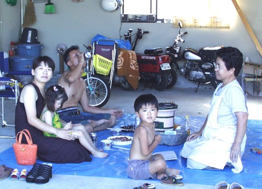 | 海での日焼けに苦しんでいた気だるい昼下がり、突然我家に嵐がやって来た。 病院帰りの正義登場!『飲むが?』の言葉に、まるで当たり前のように『あぁっ』 これが悲劇の始まりであった。1人増え…2人増え…シートが引かれ…炭が熾き… 七輪BBQの始まり始まり… |