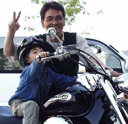 ![]() 飛入り参加の小野ちゃんのバイクに跨る諒と三浦さん |