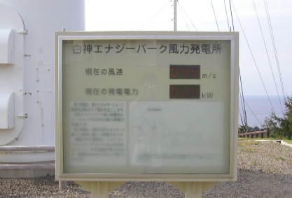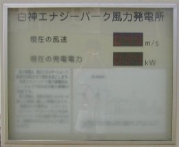 | 啓発表示板の下半分は残念ながら結露により文字が読めません。 当日は、風速4.9m/sの風が吹き、34kWの出力がありました。 ![]() |