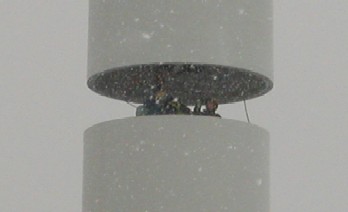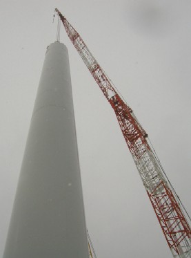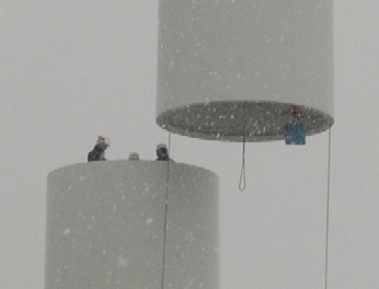 風はこの季節にしては珍しく穏やかだったものの、時折雪が激しく舞い落ちる生憎の天気でした。 大型クレーンで2本目を吊り上げ、ボルトの接合をする作業者は1本目タワー上部で待ち構えます。