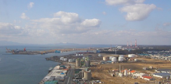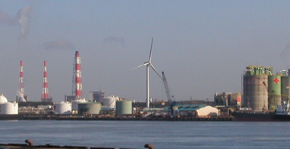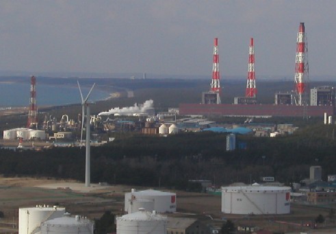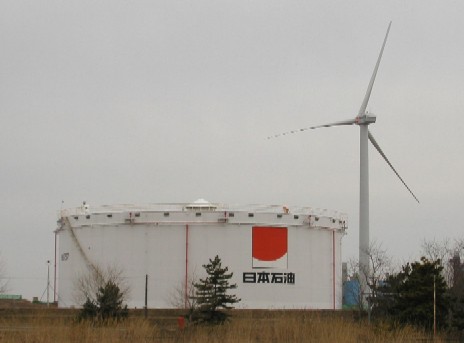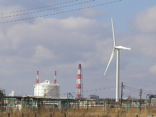 風車の奥に見える煙突は東北電力秋田火力発電所。 化石燃料の大型貯タンクと大量消費施設に挟まれた風車の組合せは 地球温暖化防止のポスターにでも採用されそうな構図ですね。(笑) ※3月23日写真差替え ![]() |