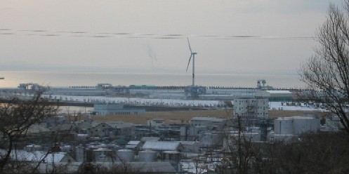 男鹿市内を見下ろす高台からのアングル 平坦な設備が多い備蓄基地内に高さ100m近い風車が良く映えますね。 ![]() |