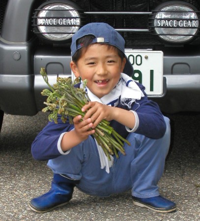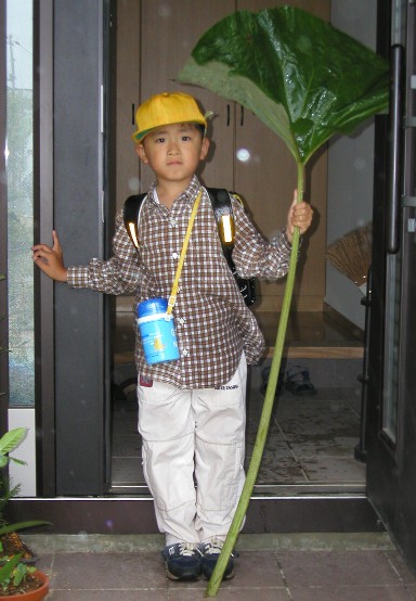 | 2002/6/11小学校の行事で秋田名物大蕗を刈りました。 秋田音頭で「〜唐傘などいらぬ〜♪」と唄われる諒の背よりも大きい蕗 ![]() |