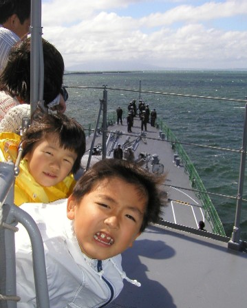 2002/6/2近所のお友達の家から護衛艦「夕霧」の乗船チケットを頂き乗る事に![]() 秋田港を出航し、いざ2時間の船旅へ! 風が強かったこの日、港を出た途端船が揺れ始め、お父さんは良い気分に… ![]() |