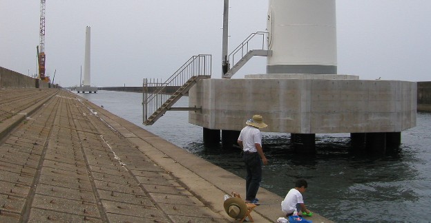 | 酒田北港の水路上に建設された5号機 鯛や鯵、キス等の魚を釣ったと手前の子供から自慢されてしまった。(笑) ![]() |