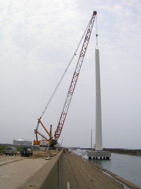 | 3本目のタワーが間もなく連結されます。 当日は風がなかった事からスムーズに作業が進んだようです。 ![]() |