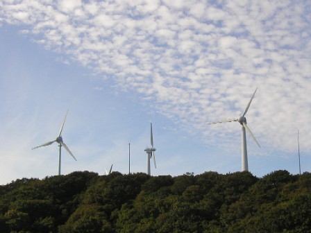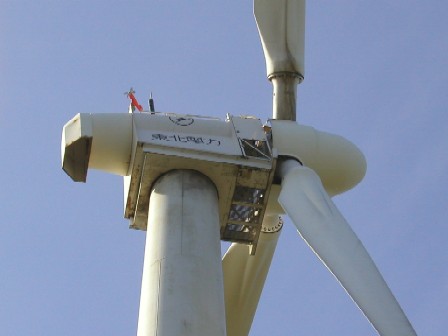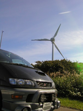 | 穏やかな空の下、本日運転中だったのは6号機を挟んで11号と7号の2台 面白い事に、ブレードの回転方向が左のエネルコン機は現在一般的な風上から見て時計方向、右の三菱は逆方向である。ホテルの部屋からはちょうど2台が重なって見えた事から、まるで同心円上で逆に廻る2セットのブレードを備えた最新鋭の風車かと思いました。(笑) 2002/9/22動画(1.3MB) ※要QuickTimePlayer ![]() |