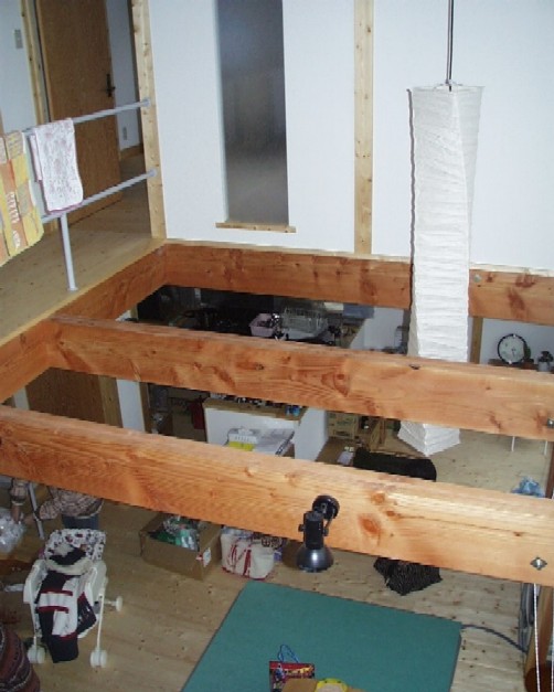 居間の上部は吹抜けとなり、主寝室(写真奥)へは渡り廊下でつながります。 ![]() |